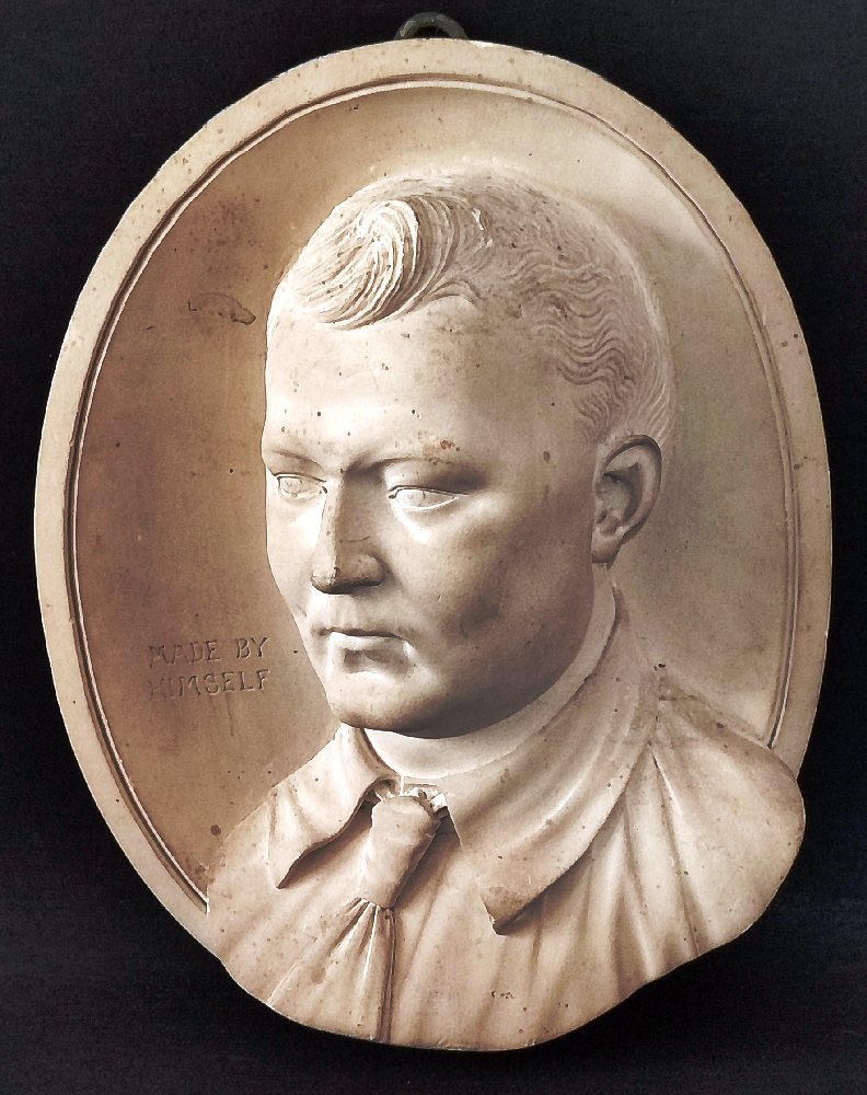19th C. stoneware wall hanging oval plaque 'Male Portrait' With inscription made by himself
