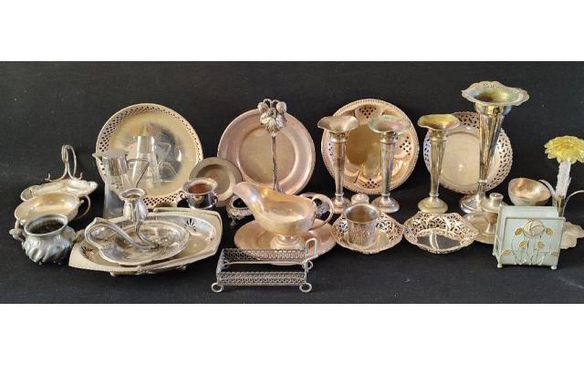 Silver plated bud vases, sauce boat, jug, chamber candle stick etc